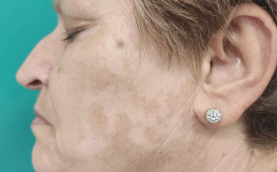 Well‐circumscribed depigmented patches in both cheeks, forehead and between eyebrows